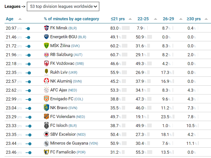 У «Ислочи» средний возраст 23,33 года. По этому критерию команда Дмитрия Комаровского занимает 12 место. Также в исследовании указан процент минут по возрастным категориям, по которому видно, насколько тренерский штаб доверяет молодым игрокам. Так, например, футболисты «Ислочи» до 21 года имеют большой процент проведенного времени на поле (38,7%). Благодаря этому показателю клуб из Минского района разместился на 15 строчке.