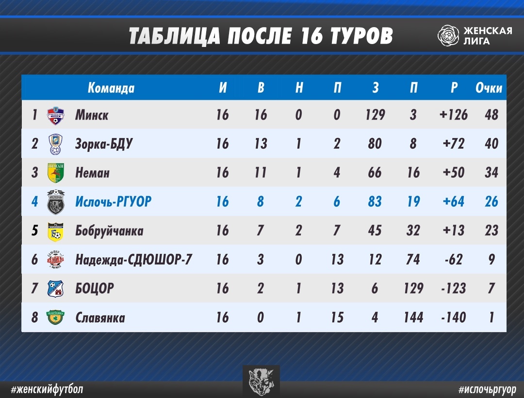 В 17 туре наша женская команда «Ислочь-РГУОР» сыграет на выезде против БОЦОРа. Матч пройдет 6 сентября на поле с искусственным покрытием Брестского областного центра олимпийского резерва по футболу по адресу: г. Брест, ул. Высокая, 19. Начало в 18:00. Вход – свободный.