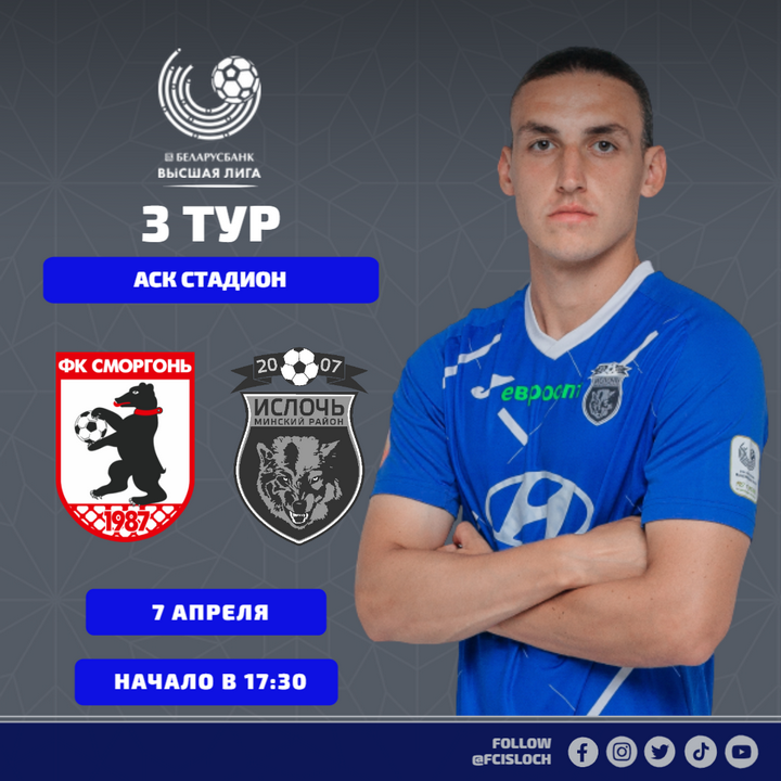 В минувшем туре «Ислочь» крупного победила брестское «Динамо» (3:0), а «Сморгонь» с минимальным счетом уступила жодинским «автозаводцам» (1:2). На данный момент у обеих команд по 3 очка в турнирной таблице. В предстоящем матче парни Дмитрия Комаровского будут играть в следующей форме: полевые футболисты выйдут в белом комплекте, а вратарь в зеленом. Прямая трансляция будет доступна на телеканале «ЯСНАе TV».
