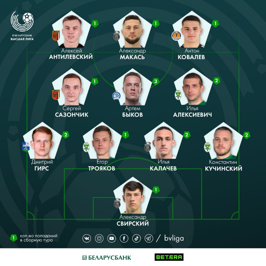 По итогам матчей прошедшего игрового уик-энда федерация футбола составила символическую сборную, куда вошли игроки различных клубов. В этот раз в ней оказались вратарь Александр Свирский, защитник Илья Калачев и нападающий Александр Макась. Все они помогли «волкам» одержать первую победу в Бресте (1:0). Отметим, для капитана это уже второе попадание в сборную тура.