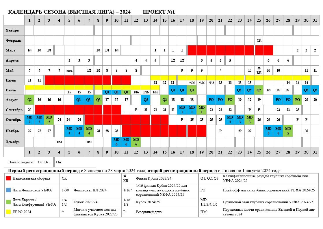 Высшая лига начнется 14 марта, а заключительный тур элитного дивизиона состоится 30 ноября. Резервные даты для переносов – 12, 24-25 сентября, 17, 29-30 октября и 21 ноября. Переходные матчи пройдут 4 и 8 декабря. Уже традиционно будет пять международных пауз для игр сборных.